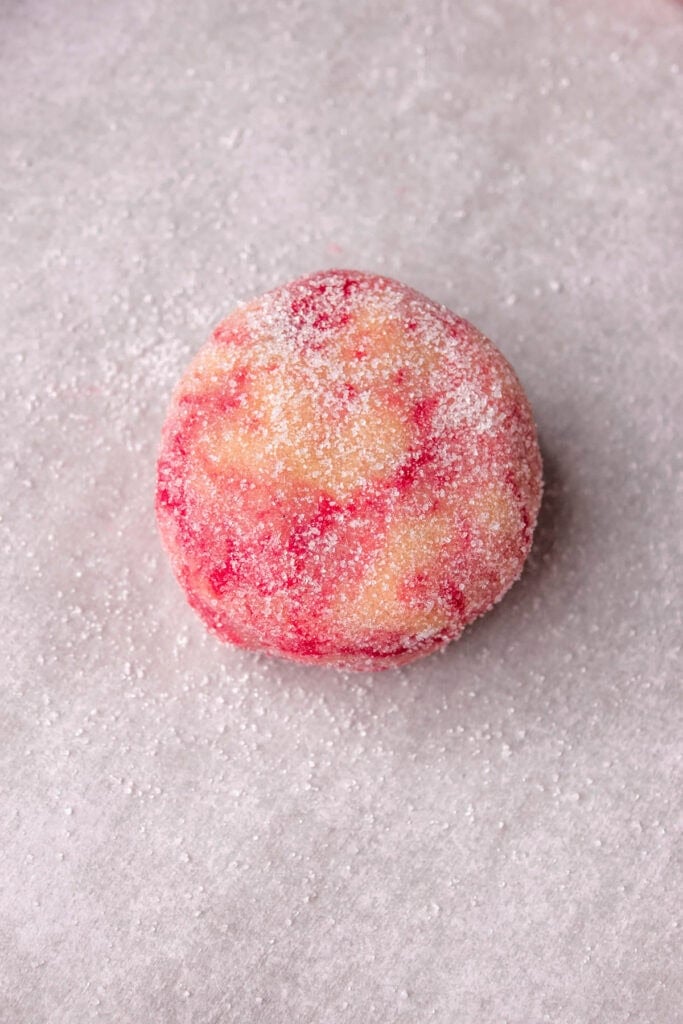- Roll the cookie dough in sugar.(Keep the cheesecake balls in the freezer until ready to use for each batch of cookies.)1/4 cup (50 g) granulated white sugar, for rolling dough in