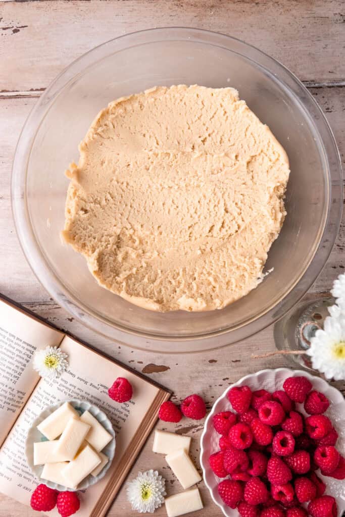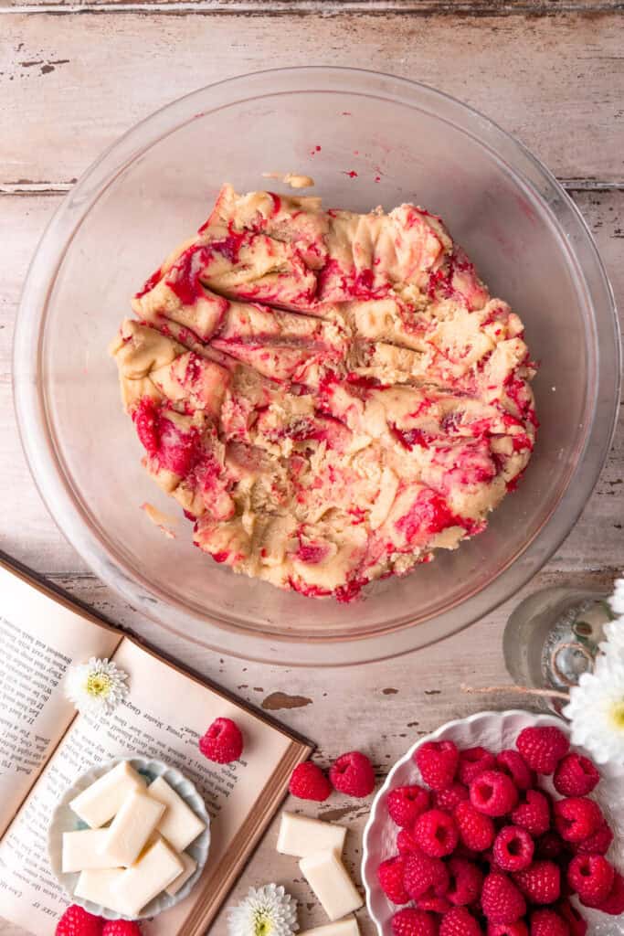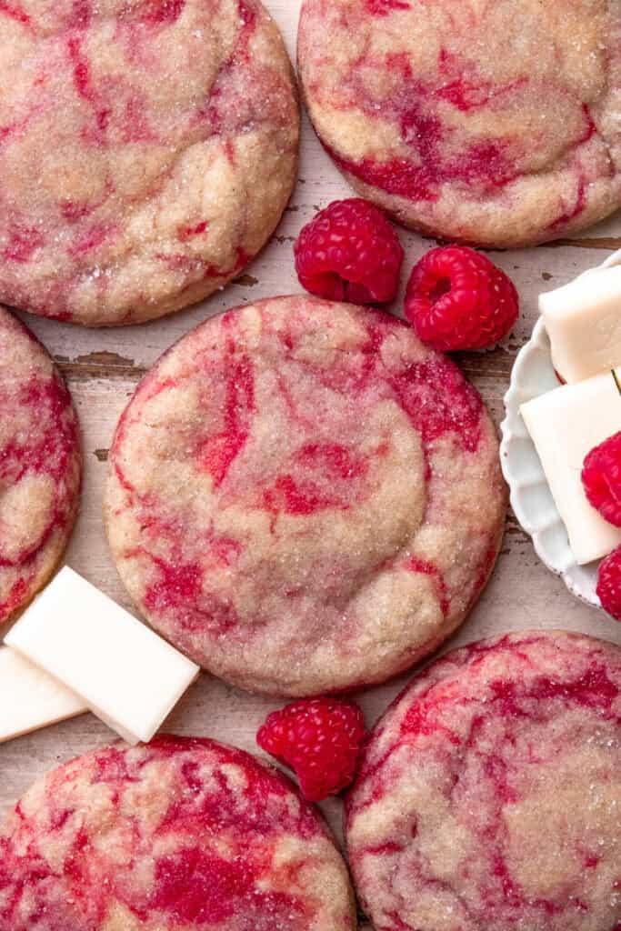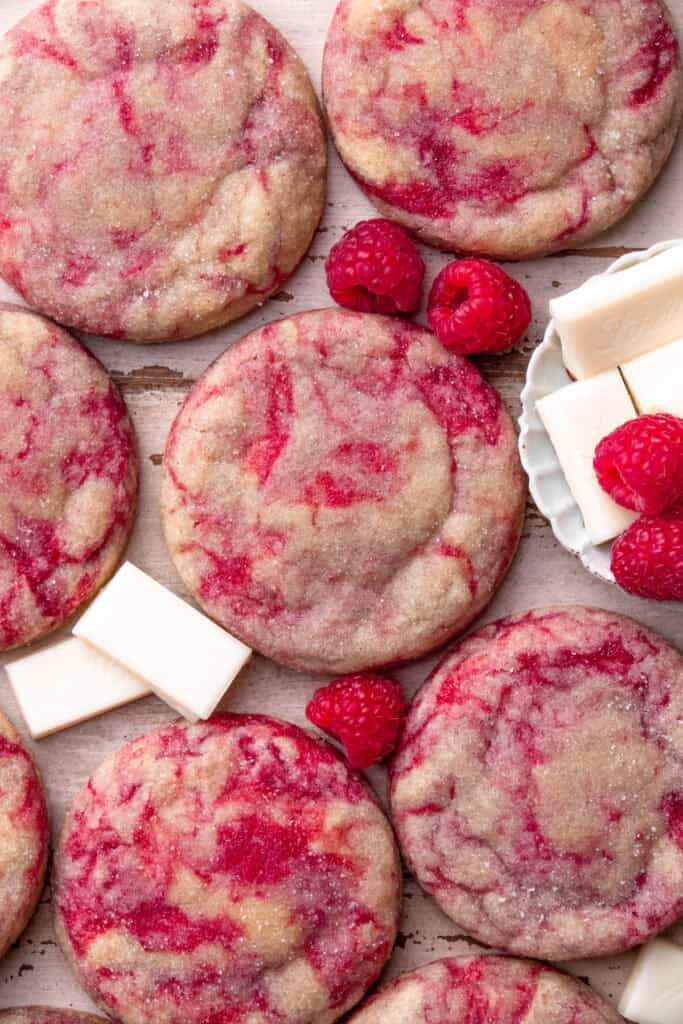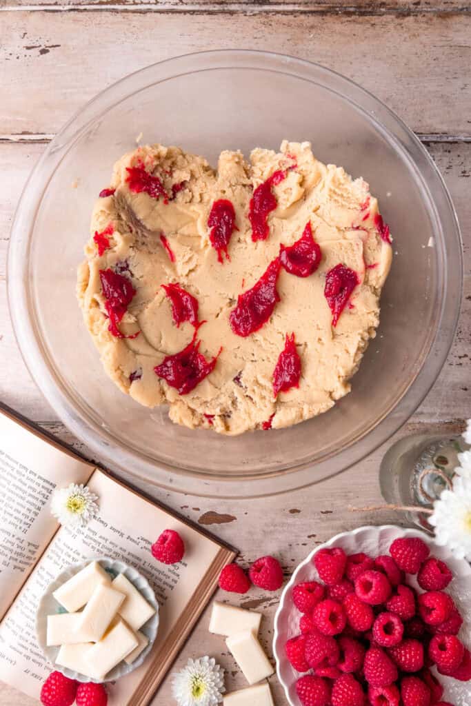 They have the perfect amount of raspberry flavor. The dough is flavored with a very thick homemade raspberry jam to add the most fresh raspberry flavor, without adding too much extra moisture to the cookie dough. By reducing the jam a lot, we’re able to keep the cookies extra chewy!