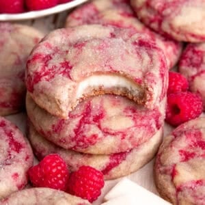 These perfect raspberry white chocolate cheesecake cookies are soft and chewy sugar cookies, with jammy raspberries throughout, stuffed with a creamy white chocolate cheesecake filling. They’re chewy, buttery, full of fresh raspberry flavor, and taste just like raspberry white chocolate cheesecake in cookie form!