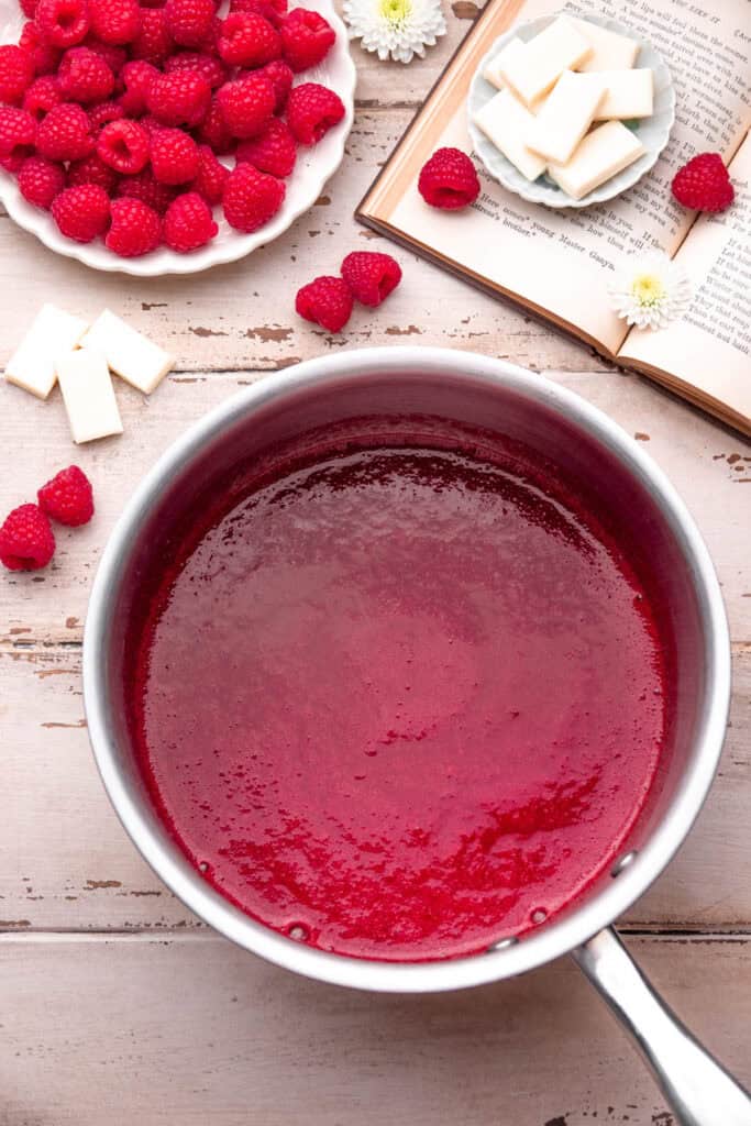 - Add the raspberries to a medium saucepan over medium low heat. Heat for about 5 minutes, mashing at the beginning, until the raspberries break down and are liquidy.12 oz (340 g) fresh raspberries