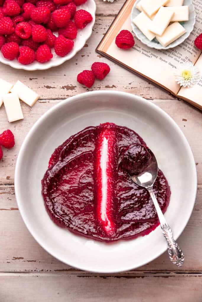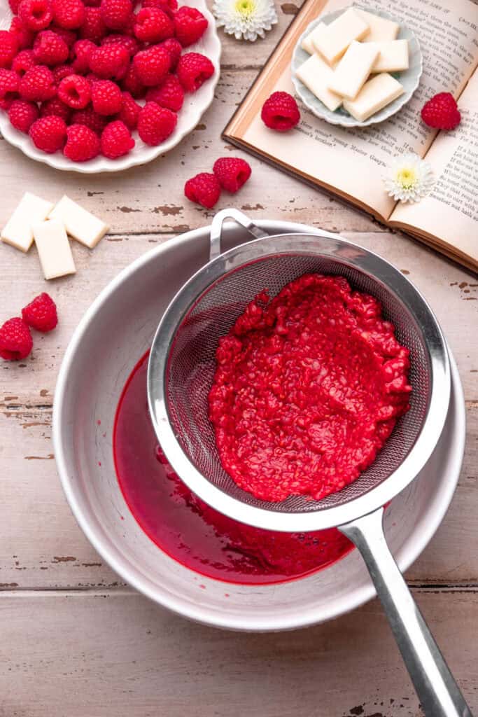 - Over a medium bowl, pass the raspberries through a sieve to remove the seeds. You should have about 3/4 cup (180 ml) of liquid. (You'll really want to press the raspberries against the sieve to get as much liquid out as possible. See photo in the blog post above.)