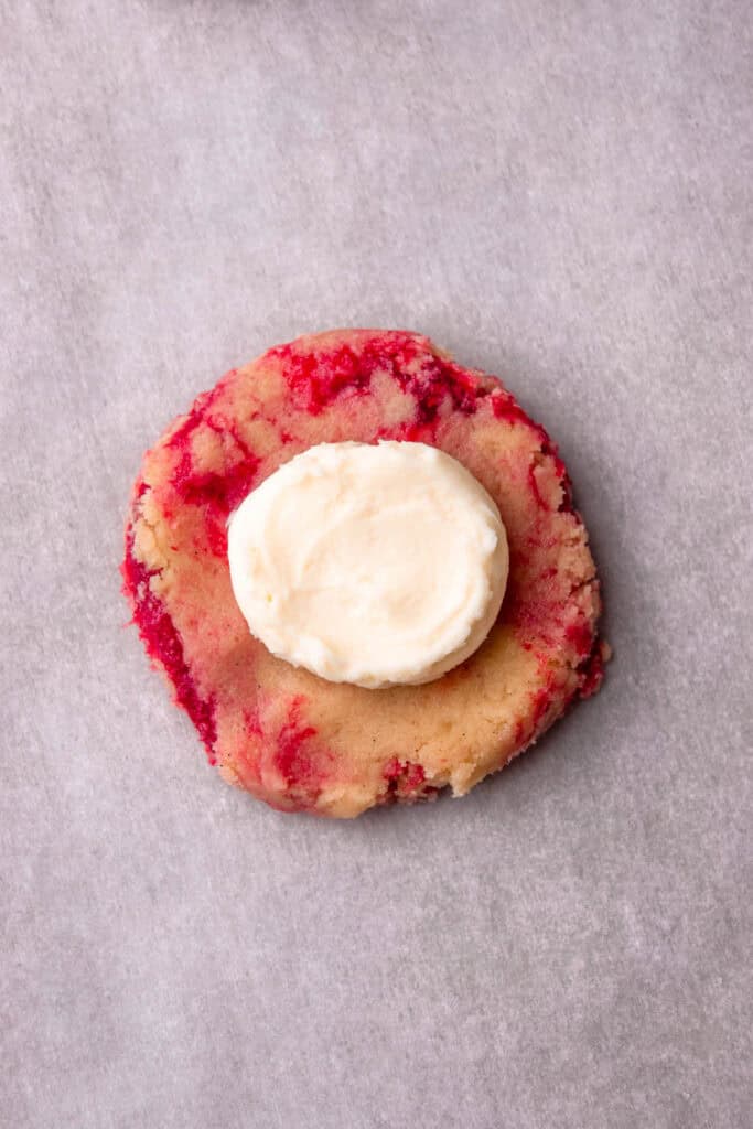 - Scoop the dough into 20 portions with a 2 tbsp cookie scoop. Slightly flatten out each then place a frozen cheesecake disc in the center. Then close the cheesecake in with the cookie dough. Make sure the cheesecake is completely covered in cookie dough. Shape each cookie dough section into a slightly flattened disc, rather than a ball.(The cookie dough does not spread as well if not slightly flattened.) See photos in the blog post above.